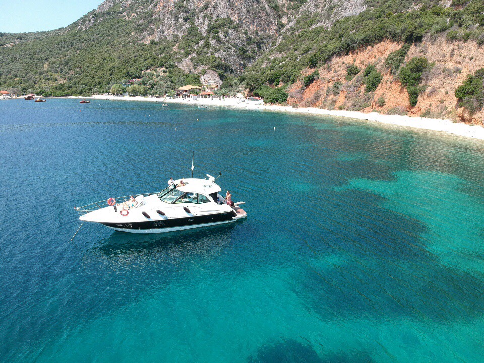 Then comes the opportunity for the customers for more swimming, or dining in a taverna, at the bay of Agnontas where the boat in the number Money Money Money was moored